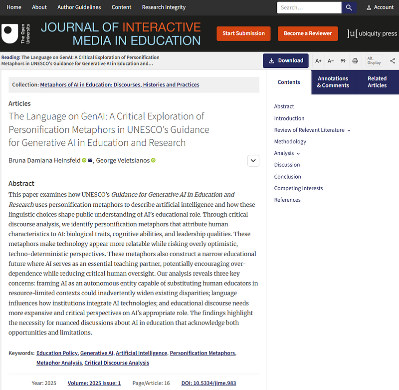Heinsfeld, B. D., and G. Veletsianos. “The Language on GenAI: A Critical Exploration of Personification Metaphors in UNESCO’s Guidance for Generative AI in Education and Research.” Journal of Interactive Media in Education 1, no. 16 (2025).