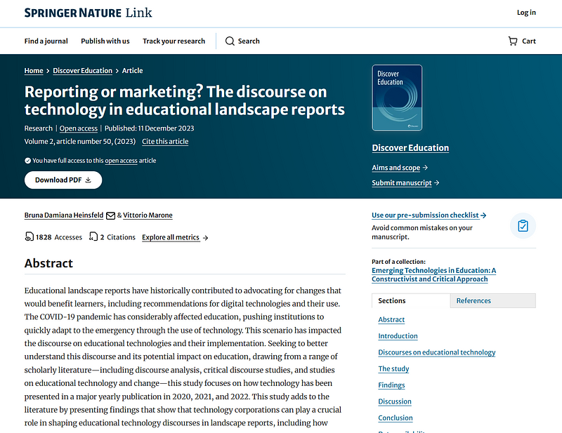Heinsfeld, B. D., & Marone, V. (2023). Reporting or marketing? The discourse of educational landscape reports on technological trends. Discover Education, 2(50). https://doi.org/10.1007/s44217-023-00075-6