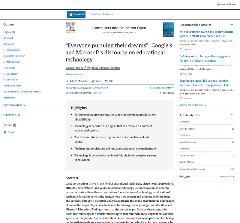 Marone, V., and B. D. Heinsfeld. “Everyone Pursuing Their Dreams: Google’s and Microsoft’s Discourse on Educational Technology.” Computers &Amp; Education Open, vol. 4, no. 100138, 2023, doi:10.1016/j.caeo.2023.100138.