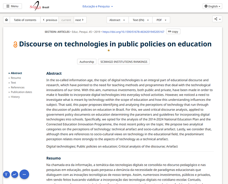 Heinsfeld, B. D., & Pichetola, M. (2019). Discourse on technologies in public policies on education. Educação e Pesquisa, 1. https://doi.org/10.1590/s1678-4634201945205167